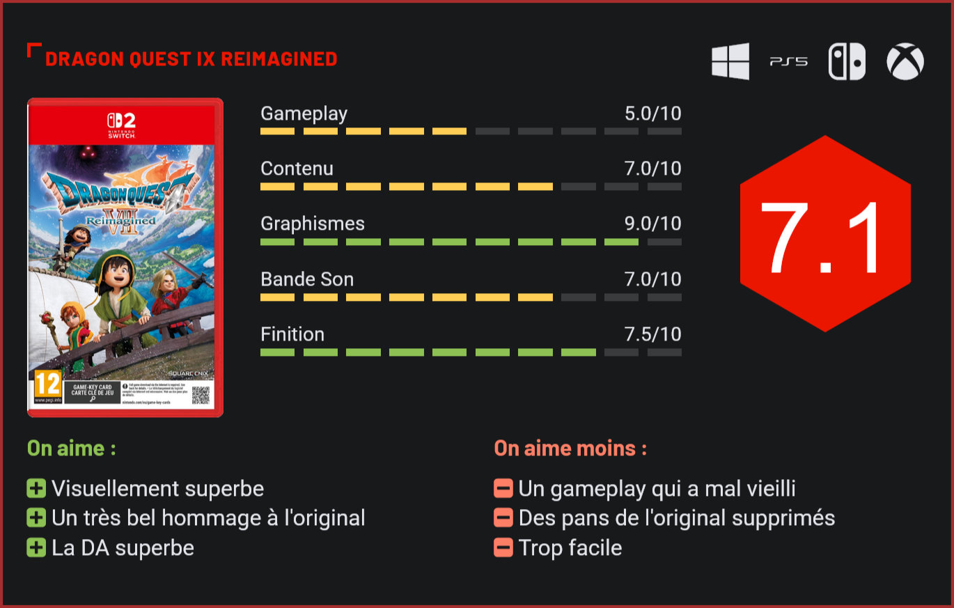 Jeu culte de l’époque de la PS One, Dragon Quest VII est considéré par de nombreux fans comme l’un des épisodes les plus marquants de la saga. Sorti en 2000 sur PSOne, Dragon Quest VII est considéré par de nombreux joueurs comme l’un des meilleurs de la saga. Après avoir remis au goût du jour les premiers volets de la série, Square-Enix nous livre aujourd’hui une relecture de ce septième opus, quelque part à mi-chemin entre le remaster et le remake. L’approche est intéressante car visuellement, cette “relecture” a tout d’un remake. Le jeu a bénéficié d’une refonte graphique complète et brille de mille feux avec ses environnements colorés, sa direction artistique ravissante et ses personnages charmants. Attention néanmoins il ne s’agit pas d’un vrai remake en ce sens que c’est pratiquement le même jeu qu’à l’époque. Certains, quelques éléments ont été supprimés, comme les mini-jeux par exemple, certains passages narratifs ont changé mais l’essentielle partie du titre, c’est le même titre qu’à l’époque, en beaucoup plus joli. Pas de refonte du système de combat, de la caméra, du système de jeu, on est face à un JRPG de l’époque PSOne sans aucune modernisation. Enfin si, mais pas forcément dans le bon sens du terme puisque le jeu a été simplifié par rapport à l’époque. Lors des combats, vous connaitrez par exemple automatiquement les faiblesses élémentaires de vos adversaires. On peut comprendre la démarche, mais ça rend encore plus accessible un RPG qui l’était déjà trop. Ne cherchez pas la difficulté dans les combats, il n’y en a pas. Car c’est là le principal problème de ces “vieux” JRPG, DQ9 est un jeu très – trop – facile. Même en difficile, la plupart des combats ne posent aucune difficulté. Pire, ils se montrent également fort répétitifs, avec une mise en scène extrêmement classique et absolument zéro surprise… Oubliez toute forme de stratégie. Du coup on en vient à se demander s’il n’aurait pas mieux fallu revoir tout ça pour proposer un peu plus de challenge, car on se rapproche pratiquement de combats automatisés. Côté exploration, le joueur est également pris par la main, là où l’original vous laissait vous débrouiller. Ce n’est pas plus mal en soi vu que les standards ont évolué, l’ennui c’est que les objectifs ne sont pas toujours bien indiqués et qu’il arrive de tourner en rond plusieurs dizaines de minutes dans une zone avant de trouver enfin où se rendre précisément. Les environnements sont charmants. Vous l’aurez compris, si vous n’aviez jamais joué à l’original, vous risquez d’avoir un choc car face à un Expedition 33, DQ9 n’a de RPG que le nom. Pas de tactique ou presque, une mise en scène simpliste, un scénario qui a forcément mal vieilli… Le jeu est avant tout un hommage à l’original. Un hommage qui risque de ne pas totalement plaire aux fans qui déploreront sans doute sa trop grande simplicité. Reste que pour ceux qui adhèrent à ces formules de modernisation, DQ9 Reimagined montre un charme fou avec ses décors colorés, ses personnages charmants et son aventure enfantine. Les fans seront toutefois agréablement surpris par un élément : les changements narratifs en fin d’aventure, avec des passages inédits qui apportent un vrai plus. Conclusion Avec Dragon Quest IX Reimagined, Square-Enix nous livre une relecture d’un classique du JRPG. Visuellement, le titre est une claque monumentale qui rend brillamment hommage au jeu sorti sur PSOne. Les graphismes sont colorés, mignons et délicieusement rétro. L’ennui, c’est que si visuellement ce “remake” est plutôt réussi, il n’a pas grand chose d’intéressant à proposer. C’est – plus ou moins – le même jeu que l’original, avec quelques nouveaux passages, les mini-jeux en moins et plusieurs aspects simplifiés. Les fans aimeront la plongée nostalgique mais il faut bien l’admettre, avec un challenge 0 et des mécanismes d’il y a 25 ans, difficile de tomber sous le charme quand on n’y a pas touché à l’époque… Reste que Square-Enix maitrisé désormais parfaitement cette formulE;
