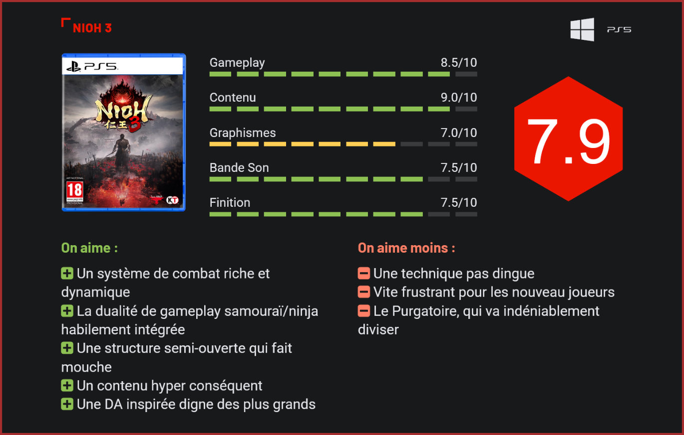 Avec ce troisième épisode, la Team Ninja fait évoluer sa formule en introduisant une structure semi-ouverte et une dualité de gameplay entre ninja et samouraï, tout en conservant l’exigence qui a fait le succès de la série. Et oui, encore un jeu basé sur le Japon féodal. Après Ghost of Yotei, Assassin’s Creed Shadows ou encore Onimusha, on frôlerait presque l’overdose. Pourtant, après seulement deux épisodes sortis en 2017 et 2020, la série Nioh est très rapidement parvenue à s’imposer comme un must-have sur PC et sur les consoles de Sony. Nioh et Nioh 2 ont reçus les louanges des joueurs et de la presse, dépassant en mai 2025 les 8 millions de copies vendues. Un chiffre qui va probablement continuer de croître avec la sortie récente de Nioh 3. Mais pour cela, il faudrait que ce troisième épisode soit, au moins, à la hauteur de ses illustres prédécesseurs. Pour cela, la Team Ninja mise sur de nombreuses nouveautés, et non des moindres. Monde semi-ouvert, dualité du gameplay entre ninja et samouraï… Nioh 3 s’annonce comme une véritable révolution dans la saga, en s’inspirant des plus grands, comme Elden Ring. Pour ce nouvel épisode, les développeurs semblent avoir eu l’idée de donner un véritable coup de frais à leur franchise. Ce troisième épisode tourne autour d’un axe de gameplay principal, qui est la dualité du gameplay autour des styles samouraï et ninja. D’une part, on retrouve le style samouraï, propre à l’univers et l’ADN Nioh. Il conserve un gameplay basé sur des postures haute, moyenne et basse, une gestion fine du Ki, des parades et des contre-attaques. De son côté, le style ninja rafraîchit totalement la formule. Le joueur doit revoir totalement sa manière de jouer, en privilégiant la mobilité, l’agressivité, le ninjutsu, les esquives rapides et une pression constante. Les combats et la dualité samouraï/ninja représentent la vraie force de cet épisode. La force du titre est de permettre de basculer instantanément entre les deux styles, et ce, même en plein combat. Avec des combats nerveux mais exigeants, techniques voire frénétiques, Nioh 3 parvient à lui seul à proposer un système de combat extrêmement riche, parmi les plus réussis du genre. Très réussi, mais pourtant tellement exigeant, au point d’en être frustrant. La série Nioh est réputée pour être particulièrement difficile. Certes, pas autant qu’un Demon’s Souls ou un Elder Ring, mais elle a tendance à s’en inspirer, notamment avec le fameux Purgatoire, l’une des autres nouveautés de cet épisode. Il s’agit d’une zone corrompue par les Yokai, une version plus hostile d’un lieu déjà exploré. Le Purgatoire, c’est d’abord une difficulté amplifiée, avec des ennemis plus agressifs aux dégâts augmentés et des combats plus punitifs. Mais le Purgatoire, c’est surtout une barre de santé qui se dégrade à mesure que les coups subis s’enchaînent. Plus vous recevrez de coups, plus votre vie maximale diminuera. Le seul moyen de récupérer cette barre est d’attaquer ou de se purifier. Nioh 3 dispose d’une DA inspirée, avec le retour des esprits protecteurs qui nous apportent plusieurs bienfaits. Le “problème” (bien que ce n’en soit pas réellement un), le Purgatoire est pensé pour offrir du meilleur loot au joueur. Plus dur, certes, mais il fait office d’accélérateur de progression pour les joueurs les plus aguerris. Représentant un pic de difficulté parfois excessif pour certains novices, le Purgatoire se divise en deux catégories : les majeurs (non optionnels intégrés à la trame principale), et les mineurs (disséminés dans les zones ouvertes). Malheureusement pour certains, il faudra composer avec les Purgatoires majeurs pour progresser dans l’histoire. La dernière vraie nouveauté de cet épisode est sa nouvelle structure. Fini le système de missions cloisonnées, le jeu possède maintenant des petits mondes semi-ouverts remplis d’activités, de camps ennemis, de purifications ou encore de collectibles. On n’est pas sur un open world total à la Assassin’s Creed, mais ces zones ouvertes représentent une vraie évolution pour la série. Le jeu pousse à la découverte de ces zones, permettant de récupérer plusieurs bonus, des points, l’amélioration des élixirs ou encore de l’équipement rare. La Team Ninja a cependant encore du travail avant de créer un monde ouvert véritablement cohérent comme les références du genre. Le titre présente en effet une structure encore scolaire, parfois trop encadré. Visuellement, c’est sympa, mais pas wouah. Tout cela s’ajoute à un contenu qui est déjà extrêmement conséquent. Nioh 3 est absolument gargantuesque, proposant 14 armes, deux styles de combat complets et distincts, de multiples arbres de compétences (plusieurs arbres par style et part arme), des esprits protecteurs, les noyaux d’âme, les titres (ces objectifs sous forme de défis), les Kodama à trouver sur les maps, la forge, un New Game+, un mode coop… Les développeurs ne rient pas de nous avec ce nouvel épisode, et on sent les 79€ bien investis. Comptez une trentaine d’heures pour finir l’histoire principale et plus du double pour compléter le jeu à 100%. Mais grand jeu ne rime pas nécessairement avec beau jeu. A l’instar de ses deux prédécesseurs, Nioh 3 est un jeu sympathique visuellement, mais bien loin de ce que la PS5 est capable d’afficher en fin de vie. On retrouve un jeu bourré de charme, prenant place au Japon, avec une direction artistique très qualitative et une narration plaisante, mais dénué de paysages contemplatifs à la manière d’un Ghost of Yotei. Conclusion Nioh 3 réussit son pari d’évolution en apportant une vraie fraîcheur à la formule grâce à sa dualité ninja/samouraï et à une structure semi-ouverte qui modernise intelligemment la série. Son système de combat, d’une richesse impres