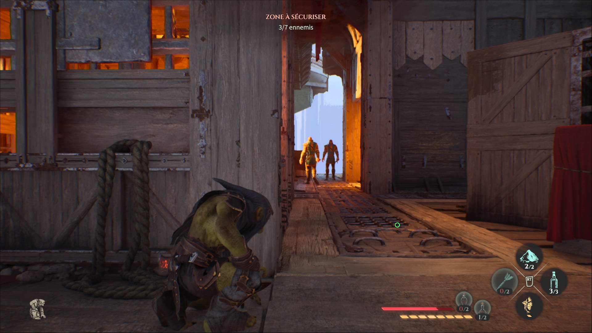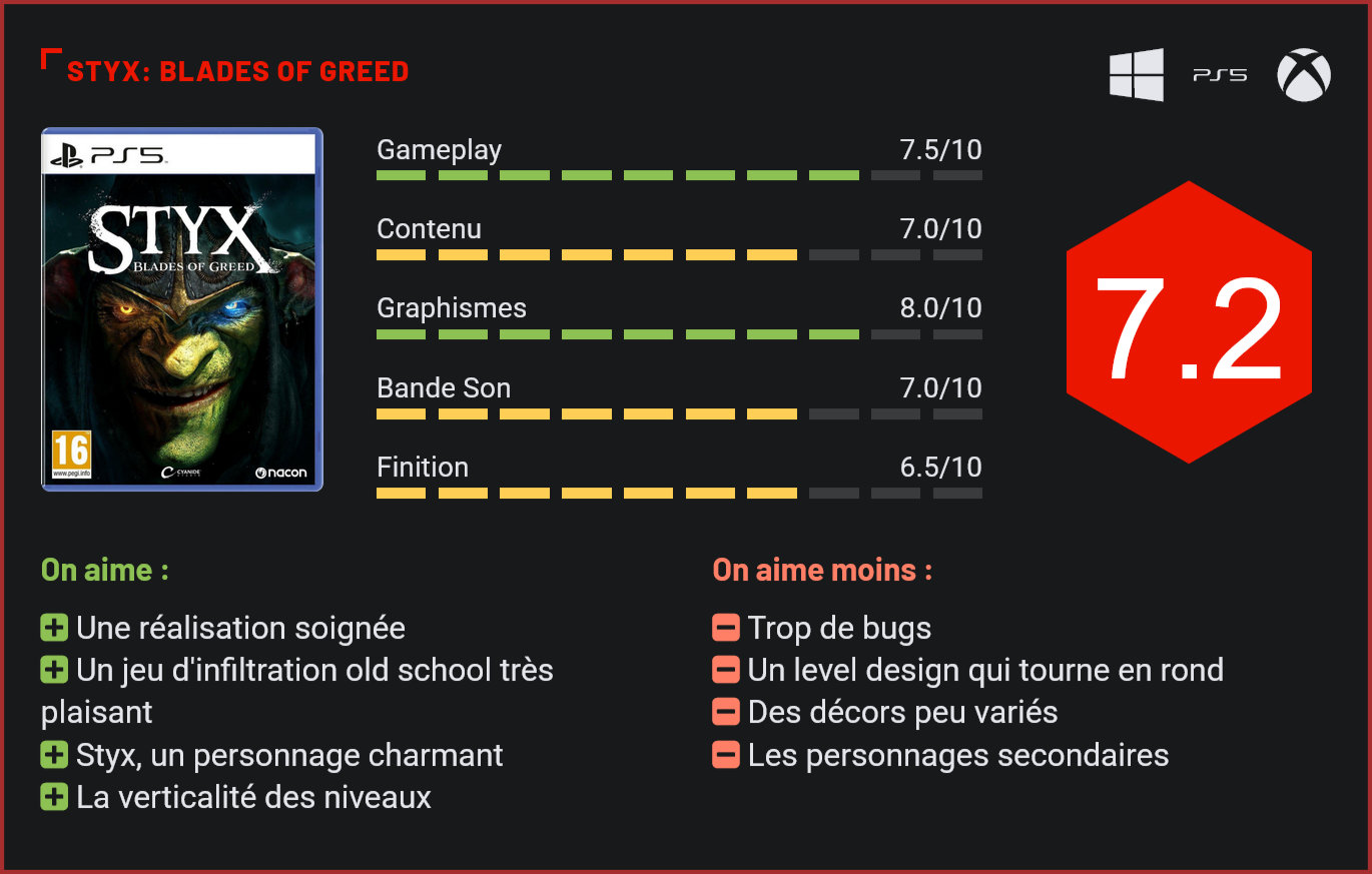 Cela faisait 9 longues années que Styx avait disparu des radars. Le studio français Cyanide offre à ce curieux personnage un retour inattendu avec Blades of Greed, troisième volet de la série et l’épisode le plus ambitieux à ce jour. Ca s’annonçait déjà très bien avant la sortie du titre. D’une part parce que les premiers Styx étaient des jeux d’action / infiltration plutôt sympas. D’autre part, parce que ce troisième volet s’annonçait beaucoup plus ambitieux, tant dans sa réalisation (Unreal Engine 5) que dans sa construction, avec un level-design ouvert et quelques nouvelles idées séduisantes. Alors bien sûr, on n’était pas à l’abris d’un accident de parcours. Mais vu l’ADN du studio, une mauvaise surprise était peu probable. Et autant vous le dire d’entrée de jeu, si ce Styx: Blades of Greed ne révolutionne pas la formule, il succède brillamment à ses prédécesseurs. Pour ceux qui auraient loupé les deux premiers épisodes, il convient de contextualiser cette sortie. Styx est un jeu d’action / infiltration old-school, qui se joue un peu à la façon d’un Splinter Cell light, mais qui prend place dans un univers fantaisiste. Vous incarnez ici un gobelin obsédé par le quartz, qui va tenter de récupérer tous les cristaux qu’il rencontre pour son propre intérêt. Ces cristaux lui confèrent en effet des pouvoirs supérieurs. Vous pouvez passer sous vos ennemis en empruntant les conduits. Dès le premier contact, on se rend compte que le jeu est plutôt ambitieux, avec de jolies cinématiques qui semblent tout droit sorties d’un film. Il ne faudra néanmoins pas trop en attendre du scénario du jeu, qui reste atrocement bancal, et qui n’est qu’un prétexte à nous faire voyager dans les trois biomes du jeu. Forcément, on en attendait plus car ce troisième Styx était censé être un simili-AAA. Avec ses personnages secondaires peu intéressants, Blades of Greed est loin de tirer parti de l’énorme potentiel de l’univers d’Of orcs and men. Et c’est bien dommage au vu de la personnalité flamboyante de Styx, un gobelin atrocement égoïste au cynisme foudroyant. Très bien écrit, le personnage est d’ailleurs admirablement doublé, ce qui ne fait qu’ajouter à notre frustration… Pad en main, Styx: Blades of Greed montre assez rapidement tout son potentiel. La principale différence avec ses ancêtres ? Des niveaux beaucoup plus ouverts qui laissent au joueur le choix de l’approche. Et ça change tout puisque le titre est non seulement moins dirigiste mais également beaucoup plus addictif. D’autant plus que la verticalité des niveaux est joliment exploitée. Chaque construction pourra explorer sur quatre, cinq, voire six étages. Notez toutefois qu’il faudra rester silencieux. Certes, il est possible d’affronter un ou deux ennemis au corps à corps, en frontal, mais vous risquez d’y perdre quelques plumes, le système de combat n’étant pas à votre avantage. Et surtout, si l’alarme résonne, vous serez vite dépassé. Tout repose donc sur l’infiltration. Styx se faufile dans l’ombre, il est très agile. Il faudra observer les rondes des ennemis pour les éviter soigneusement, passer sous les tables, se cacher dans des tonneaux, s’accrocher aux rebords pour passer devant une fenêtre, sauter de lustre en lustre, passer par des souterrains… Vous aurez quelques gadgets à votre disposition. Vous pourrez utiliser des fléchettes pour éliminer vos ennemis, éteindre manuellement les bougies ou jeter du sable dessus pour profiter de l’ombre, attirer l’attention des gardes en brisant une bouteille à quelques mètres de vous, contaminer de l’eau pour tuer les gardes qui s’y abreuvent… Les possibilités sont nombreuses et plutôt joliment exploitées. Pad en main, on a l’impression de jouer à un jeu de l’ère Xbox 360 / PS3, et ça fait furieusement du bien. D’autant plus que la difficulté est au rendez-vous avec des ennemis retords, une IA très correcte et quelques passages tendus. Seulement voilà, tout ne fonctionne pas aussi bien… Le jeu est livré dans un état pas franchement convaincant à la sortie. Nous avons été témoins de nombreux bugs, d’ennemis qui ne sortent pas du statut d’alerte, qui vous entendent sans aucune raison, des chutes dans le vide imprévues du personnage et j’en passe. En moyenne, une toutes les 20 minutes. Ce n’est pas dramatique en ce sens qu’on n’a été confronté à rien de bloquant. Néanmoins, nous ne saurions que trop vous conseiller d’attendre un gros patch avant de vous lancer car ça affecte forcément l’expérience. Il convient d’éviter de se faire remarquer… Second bémol : même si le jeu et ses niveaux ouverts sont réussis, on n’est pas totalement convaincus par le système de progression avec les voyages par zeppelin et ses niveaux qui se ressemblent trop. Le level-design tourne vite en rond et beaucoup de joueurs lâcheront le jeu en cours d’aventure. C’est dommage car la formule est vraiment plaisante. Le jeu aurait gagné à proposer une formule plus variée et peut-être plus dirigiste en définitive… Côté technique, Styx: Blades of Greed est une belle réussite. Le jeu exploite joliment l’UE 5. Les décors sont superbes, les modélisations soignées, les effets de lumière très réussis. Globalement, ce nouveau Styx impressionne et nous donne l’impression d’être un vrai triple-A. On regrette toutefois un character design pas fabuleux en-dehors de Styx. Même son de cloche pour la musique, réussie, mais pas forcément mémorable, avec des morceaux trop discrets et des bruitages qui ne sont pas assez exploités durant l’aventure – le bruit n’ayant pas énormément d’impact sur le comportement des patrouilles. Conclusion Plus ambitieux que ses prédécesseurs, Styx: Blades of Greed ne parvient toutefois pas totalement à concrétiser ses idées. C’est un bon jeu d’infiltra
