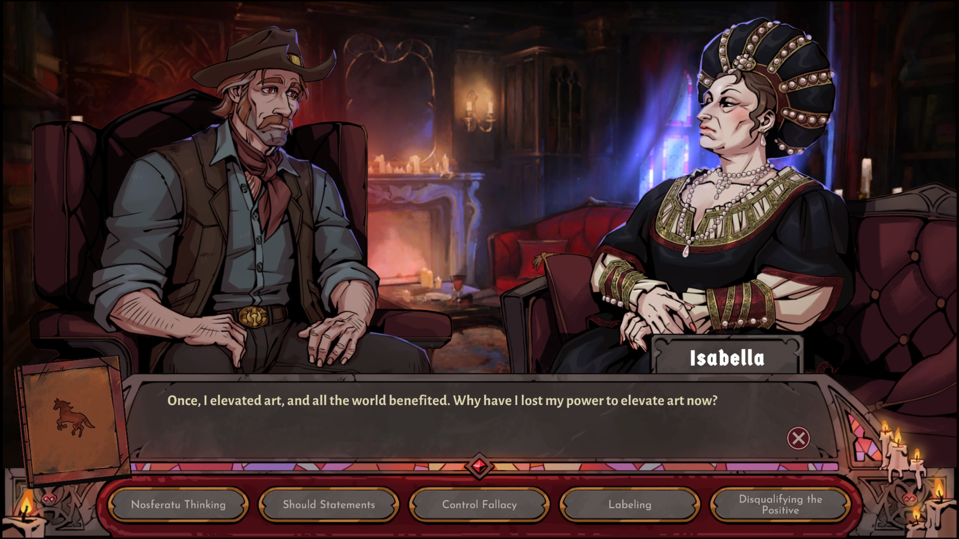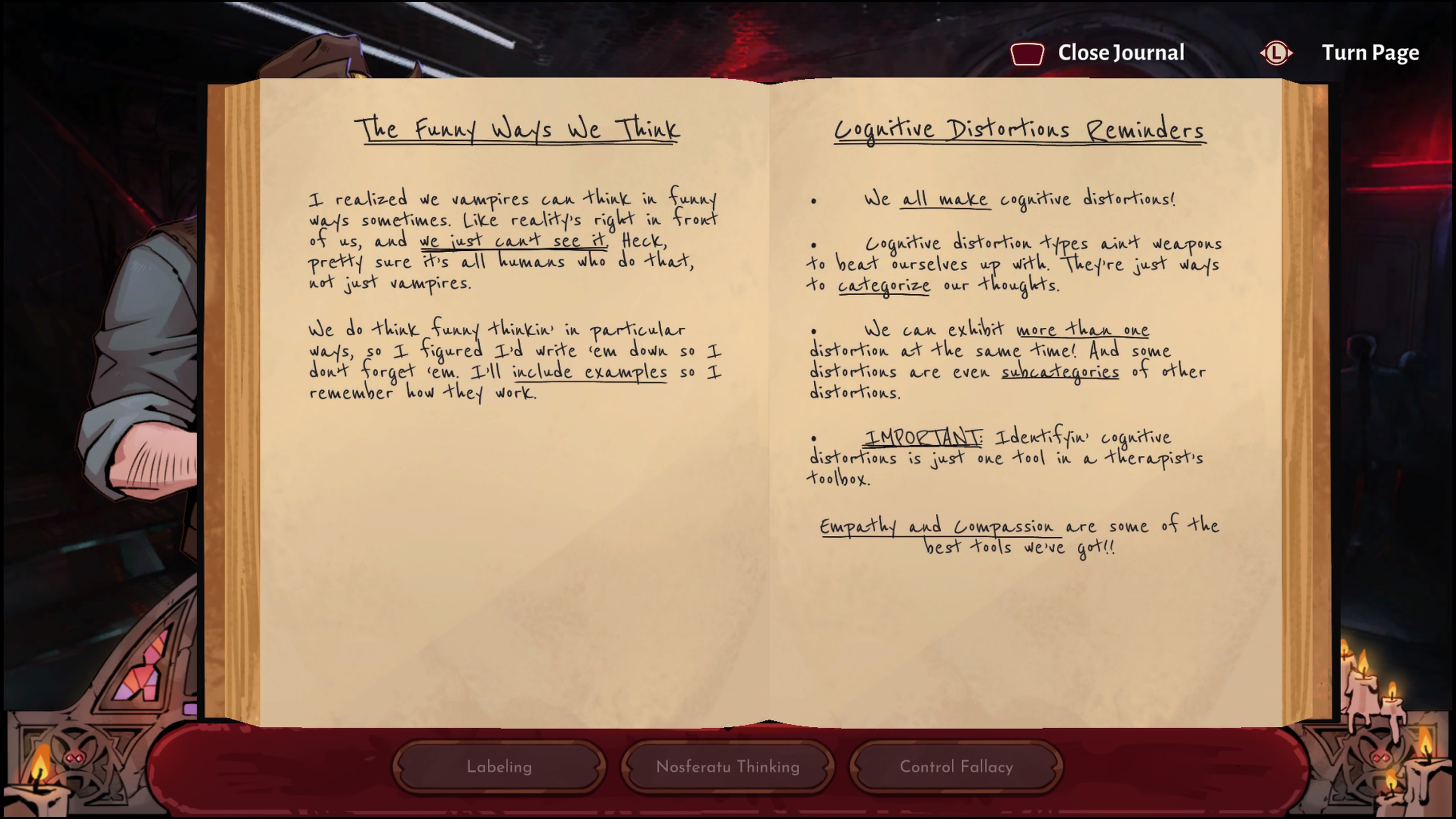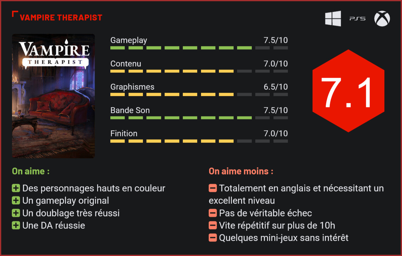 Et si votre prochain patient était un vampire dépressif accro à OnlyFans ? Vampire Therapist ose un concept aussi improbable qu’intelligent. Voilà un jeu au concept fort original. Le 18 juillet 2024, Little Bat Games publiait sur Steam le jeu Vampire Therapist : un titre dans lequel vous incarnez un psychothérapeute pour vampires à qui vous devez prodiguer des conseils pour leur éviter la catastrophe ou les sortir de leur dépression. Nous n’avions jamais rien vu de tel, de quoi bien sûr attiser notre curiosité alors que le jeu vient de sortir sur consoles de salon. Dans Vampire Therapist, on incarne Sam Walls, un cow-boy devenu vampire venu en Allemagne pour apprendre auprès d’Andromachos, un vampire de 3 000 ans, comment être un bon thérapeute pour vampires. Soigner des personnes vivant depuis plus siècles voire millénaires n’est, logiquement, pas aussi simple que soigner des mortels, et c’est là que vous devrez apprendre les ficelles du métier. Le titre fonctionne sur le principe du visual novel. Entendez par là que 90% du gameplay se base sur des dialogues, qu’il faut lire et comprendre, et que vous aurez à faire des choix qui influencent l’histoire face à des personnages illustrés en 2D. Ce style est très populaire au Japon, moins chez nous, mais a un charme indéniable, d’autant que Vampire Therapist repose sur une direction artistique qui fait mouche, basée sur des musiques agréables, un doublage 5 étoiles et des décors joliment dessinés. Ce sont des dialogues qui font l’essence-même du titre donc, autour d’un seul thème : la psychologie et, plus précisément, la thérapie cognitivo-comportementale. Développé conjointement avec spécialistes de la santé mentale, le jeu aborde des thèmes sérieux, qui peuvent même parfois provoquer un certain malaise chez certain joueur non avertis. Notre carnet nous permet, rapidement, de consulter nos notes et d’avoir plus de détails sur les distorsions cognitives. Lorsque vous discuterez avec les vampires, vous devrez analyser leurs dires et trouver les bons mots pour leur répondre, ou plutôt les bonnes “distorsions cognitives”. Un concept assez ambigu pour quiconque n’est pas familier avec le langage médical, mais qui finalement nous est très facilement (et longuement) expliqué lors du tutoriel. Concrètement, il s’agit “d’erreurs de raisonnement systématiques, de raccourcis mentaux qui déforment la réalité de manière négative, influençant nos émotions et comportements” (merci Gemini). S’il existe de nombreux exemples de distorsions cognitives à identifier dans le principe de la santé mentale, le jeu repose sur 5 distorsions à repérer dans les dialogues. Le Nosferatu Thinking voit les situations comme un duel décisif : soit tout va réussir, soit tout va s’effondrer. C’est une vision dramatique et extrême des enjeux. Il y a le Labelling, qui consiste à se coller une étiquette globale et souvent excessive pour se définir. Les Should Statements consiste à s’exprimer avec des “je devrais”, en s’imposant des règles rigides qui génèrent frustration ou culpabilité. Enfin, Disqualifying the Positive consiste à minimiser ou rejeter les choses positives (“c’est juste de la chance”), même quand elles sont bien réelles et le Control Fallacy repose sur le fait de se croire totalement en contrôle de tout… ou totalement incapable d’agir. Le titre repose sur cinq concepts psychologiques fort que l’on apprend très vite à reconnaître dans les échanges avec les patients. Des concepts complexes à comprendre, de prime abord, mais qui sont heureusement répertoriés dans notre carnet, comme plein d’autres informations, et que l’on peut consulter quand bon nous semble. Ils sont complexes, certes, mais totalement sérieux. Heureusement, les dialogues sont entourés de thèmes plus légers, comme un vieux vampire accro à OnlyFans ou un scientifique désespéré qui cherche à tout prix à étancher sa soif de sang humain avec du sang artificiel. L’idée est vraiment originale et tellement bien formulée que l’on apprécie échanger avec nos patients. Malheureusement, quelques petits défauts viennent gâcher l’expérience, comme le fait que l’on ne fait pratiquement que ça durant les 10 heures de jeu. Mis à part quelques mini-jeux sans grand intérêt, le titre ne repose que sur de la lecture de dialogues et, à moins que l’on soit encore une fois un fan de visual novel, on en a vite fait le tour. L’autre petit souci que l’on reprochera à Vampire Therapist est son manque de défi. Andromachos, notre mentor, restera constamment présent lors des dialogues pour nous épauler et, si l’on vient à faire une erreur dans notre approche de la distorsion cognitive, il interviendra aussitôt pour nous dire que le choix est mauvais et qu’il faut en faire un autre. Impossible de se tromper donc, et avec cela l’idée d’un game over s’évapore très vite. Les mini-jeux ne permettent pas à eux seuls de diversifier le gameplay. Enfin, difficile de passer à côté du fait que Vampire Therapist soit un jeu qui n’est disponible qu’en anglais. Aussi bien les textes que les doublages se font en anglais, ce qui peut rendre très compliquée la compréhension des échanges et, logiquement, l’identification des bonnes distorsions cognitives. Le jeu ne s’adresse qu’à un public d’anglophones affirmés, les autres joueurs enchaîneront quant à eux les mauvaises réponses à cause d’une incompréhension du texte… Même votre fidèle serviteur, qui a un niveau d’anglais plutôt beau, s’est retrouvé perdu face à certaines références ou expressions. Conclusion Vampire Therapist réussit le pari d’allier humour noir, introspection et vulgarisation psychologique dans un écrin de visual novel aussi original qu’intelligent. Porté par une écriture fine, un doublage de qualité et une vraie rigueur dans le 