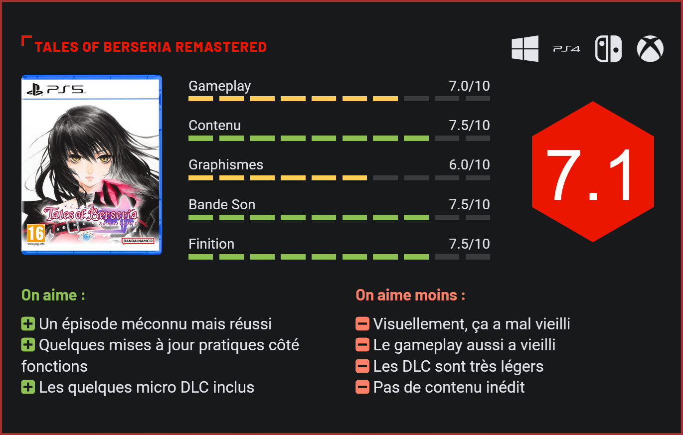 Cela fait déjà dix ans que Tales of Berseria, l’un des épisodes les plus sombres et acclamés de la saga Tales of, a vu le jour. Si la série de JRPG de Bandai Namco continue de prospérer avec des sorties régulières comme Tales of Arise, cela n’a pas empêché l’éditeur de célébrer l’anniversaire de ce préquel à Tales of Zestiria par une réédition remastérisée, disponible depuis le 27 février 2026 sur PS5, Xbox Series X|S, Nintendo Switch et PC. Vendue 39,99 €, cette édition remasterisée du jeu se veut un hommage fidèle à l’original. Pas de refonte graphique majeure ni de contenus inédits, mais un portage propre vers les machines actuelles, avec quelques améliorations pratiques l’intégration des DLC d’époque. Il faut l’avouer, même si on regrette l’absence d’un lifting graphique, nous sommes très contents de retrouver Berseria, un épisode qui mérite amplement sa seconde jeunesse. Pour bien comprendre pourquoi Berseria mérite le détour, remontons aux origines. La saga Tales of, née en 1995 sur Super Famicom avec Tales of Phantasia, s’est imposée comme un pilier du JRPG grâce à son système de combat en temps réel, le Linear Motion Battle System (LMBS), qui oppose les héros à des ennemis en vue latérale, comme dans un beat ’em up. Au fil des opus – de Tales of Symphonia sur GameCube aux épisodes plus récents –, la série a affiné sa formule : exploration semi-libre et des histoires épiques mêlant magie, politique et amitié. Mais Tales of Berseria, sorti en 2017 en Occident sur PS4, marque un tournant. Développé par l’équipe interne de Bandai Namco Studios, il s’agit d’un préquel à Zestiria (2015), mais conçu en standalone pour éviter les spoilers. L’histoire suit Velvet Crowe, une jeune femme ordinaire brisée par la “Nuit Écarlate”, un événement cataclysmique où une malédiction appelée daemonvries transforme les humains en démons assoiffés. Motivée par une soif de vengeance implacable, Velvet – dotée de pouvoirs démoniaques après un rituel tragique – rassemble une bande d’antihéros marginaux : le malicieux sorcier Magilou, l’excentrique Laphicet, le stoïque mercenaire Rokurou, et d’autres compagnons aux motivations égoïstes. Contrairement aux protagonistes héroïques habituels de la série, Velvet est une “daemonvries” enragée, prête à tout pour traquer l’abbé exorciste Artorius, responsable de ses malheurs. Ce récit philosophique oppose émotion brute et rationalité froide, explorant les thèmes de la perte d’humanité, de la trahison et du libre arbitre dans un archipel de Midgand ravagé par la peur et la religion oppressive. Sans spoiler, les twists narratifs et les skits profonds font de Berseria l’un des meilleurs scénarios JRPG, souvent comparé à Nier pour sa maturité émotionnelle. Côté nouveautés dans ce remaster, Bandai Namco a misé sur le pratique plutôt que le tape-à-l’œil. On retrouve tous les DLC originaux dès le départ : costumes crossover inspirés d’anciens Tales (comme ceux de Phantasia ou Symphonia), objets bonus (herbes de croissance, équipements puissants) et packs BGM alternatifs en Deluxe. C’est léger, mais à l’époque, on ne proposait pas forcément plus. Niveau nouveautés, on retrouve quelques petites choses comme les icônes de destination pour guider l’exploration, la possibilité de désactiver les rencontres aléatoires, le voyage rapide illimité plus tôt, et une vitesse de course accrue. Le jeu tourne en 1080p/60 ips. Pas de refonte complète ni de textures refaites, juste un léger sharpening pour un rendu plus net. Dix ans plus tard, comment Berseria a-t-il vieilli ? Il tient la route grâce à sa narration intemporelle, mais montre un visage vieilli – forcément le titre était sorti sur PS3 à la base. Les graphismes animés, avec leurs environnements variés (volcans en fusion, cités flottantes, forêts hantées), paraissent datés face à Arise, surtout les donjons grisâtres et répétitifs, remplis de couloirs sans fin et de puzzles basiques (pousser des blocs, activer des switches). Le backtracking pour les quêtes secondaires agace toujours, et l’absence d’un monde ouvert fluide se fait sentir. Côté sonore, la BO épique (thème de Velvet inoubliable) et le doublage japonais/anglais de qualité n’ont pas pris une ride, même si l’OST globale reste inégale. Autrement dit, ça passe, même si on sent le poids des années. Le gameplay reste dans la veine des autres Tales : des combats en temps réel, fidèle à la série, avec quelques subtilités comme le vol des âmes ennemies pour booster vos sorts, l’enchainement de combos, et la mise en place de complémentarité entre les personnages. Conclusion Episode méconnu et sous-estimé de la série, Berseria n’en reste pas moins l’un des plus intéressants par son approche plus dark et son scénario prenant. Le jeu était sorti à la base sur PS3 et a forcément mal vieilli, malgré quelques améliorations. On aurait en ce sens préféré un remake complet. Mais ce remaster a le mérite de rendre à nouveau disponible ce JRPG fort sympathique. Les fans de la série seront de toutes façons aux anges, malgré le poids des années qui pèse sur cet épisode.