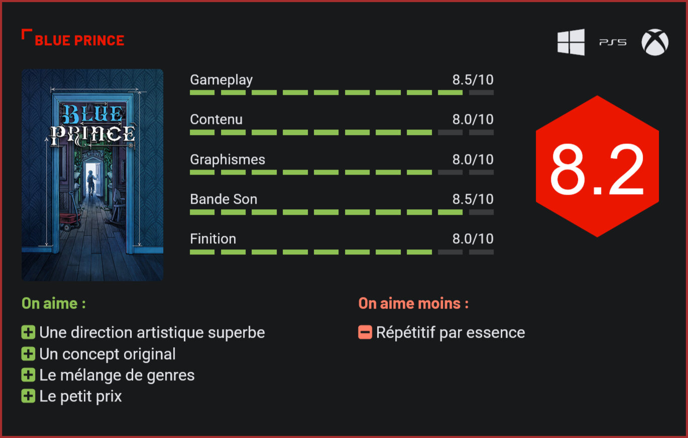 Considéré comme l’une des excellentes surprises de l’année 2025, Blue Prince est incontestablement un jeu indé à faire coûte que coûte. Sorti sur PC, PS5 et Xbox Series, il a aujourd’hui droit à un portage sur Switch 2. L’occasion de se pencher à nouveau sur ce titre atypique. Si la plupart du temps, les jeux indés sont développés par une petite équipe, il arrive que des développeurs solo parviennent à créer une oeuvre aussi marquante qu’un gros studio. Blue Prince est l’une d’elles. Sorti de l’imagination de Tonda Ros, Blue Prince est un projet qui aura pris 8 longues années pour voir le jour. Un titre à l’apparence soignée, qui brille aussi par ses mécanismes de jeu, qui mélangent puzzle, roguelite et narration. Visuellement, le titre est une réussite complète. Le jeu vous place dans la peau de Simon, un adolescent héritier du domaine de Mount Holly, imposante demeure victorienne léguée par un grand-oncle excentrique. La condition de l’héritage est la suivante : trouver la fameuse « Chambre 46 », pièce mythique que personne n’a jamais vue dans une maison officiellement composée de 45 salles. Livré à lui même dans un manoir qui recèle de secrets, le joueur va devoir explorer les lieux et résoudre des intrigues pour progresser dans l’aventure. L’histoire se dévoile par bribes – lettres, mémos, livres, indices codés – dans un récit non linéaire qui se révèle globalement plaisant à suivre. Le concept du jeu est véritablement unique et c’est d’ailleurs ce qui fait tout son charme. Chaque jour, vous disposez de 50 « pas » – les déplacements représentent ici une ressource limitée. Chaque fois que vous ouvrez une porte fermée, trois pièces sont proposées au hasard ; vous choisissez laquelle s’insère dans le plan du manoir. Le couloir que vous venez de traverser devient alors permanent… jusqu’au lendemain. Car à l’aube, le manoir se réinitialise entièrement. Un système inspiré des roguelites qui donne à Blue Prince une approche unique. Et il faut bien l’avouer, ce concept finit vite par nous charmer puisqu’il instaure un peu de stratégie dans les parties. Chaque pièce apporte son lot de surprises : bonus de pas, objets ou malus. Les objets récupérés – loupe, coupons, clés, plans – se combinent pour débloquer de nouvelles zones ou résoudre des casse-têtes. Côté énigmes, le développeur a été très intelligent. Il mélange observation, logique et décodage de documents dans une formule très efficace. Alors bien sûr, ça reste un jeu conceptuel. La mise en scène n’a rien de révolutionnaire et la narration reste au second plan. Mais si vous accrochez à la formule, vous prendre un véritable plaisir sur ce titre. L’aventure se boucle en une quinzaine d’heures mais il sera possible de poursuivre l’expérience plus loin en obtenant l’accès à tous les coffres et en résolvant les énigmes secondaires. Forcément, le jeu est un peu répétitif, mais la diversité des pièces est suffisante pour qu’on ne s’ennuie pas. Le jeu mélange exploration et puzzles. Outre son gameplay unique, Blue Prince peut également compter sur son style graphique unique, tout en cel-shading, pour briller. La direction artistique est superbe, les décors plein de charme et l’ambiance soignée. Avec son petit côté cosy, le jeu est un véritable plaisir à explorer, même si on lui reprochera sans doute le léger sentiment de solitude qui s’installe au fil des parties. La bande-son est signée par le duo néerlandais Trigg & Gusset, et est une petite merveille d’originalité avec uniquement des lignes de clarinette basse, violoncelle, synthés discrets, piano et bois qui donnent au jeu une atmosphère unique. Au final, difficile de ne pas y voir une formidable oeuvre d’art virtuelle. Conclusion Plus qu’un jeu, Blue Prince est une formidable expérience à vivre. Ce jeu atypique, à la direction artistique splendide, mélange exploration, épreuve, roguelite et narration dans un mélange qui captive le joueur de bout en bout. C’est l’une des pépites indépendantes de 2025 et incontestablement un jeu qu’il ne fallait pas manquer. Alors oui, son concept est par essence répétitif, mais croyez nous, voilà une oeuvre qui mérite le détour si vous êtes blasé des productions actuelles !