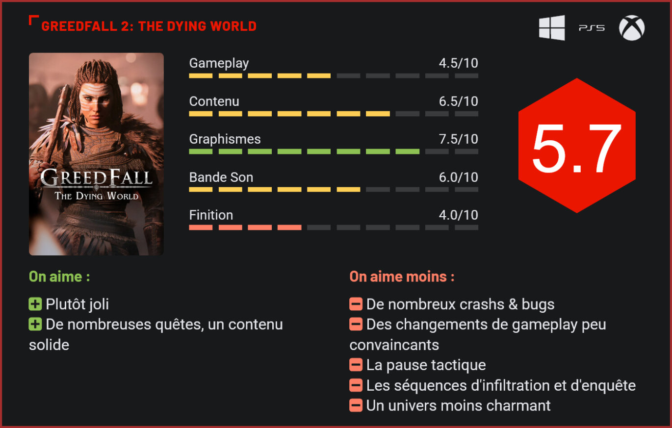 Après un premier volet plutôt réussi, le studio français Spiders nous livre un Greedfall 2 qui change radicalement de cap. Auteur d’une tripotée d’action-RPG plutôt séduisants, le studio français Spiders n’avait jusqu’ici jamais déçu ses fans. Son RPG Greedfall était même considéré par de nombreux gamers comme l’une de ses plus belles créations. Autant dire que le titre était donc attendu. Bizarrement, le studio a toutefois choisi de prendre des risques en changeant la formule. Exit le charme de Teer Fradee, le “nouveau monde” qu’on explorait dans le premier opus, vous incarnerez ici une native arrachée à son île et emmenée comme esclave sur le continent. Une approche intéressante sur le plan narratif car dans le premier volet, le joueur incarnait un diplomate continental. Les rôles sont inversés donc, mais cela a forcément des implications. Car l’ancien monde est, il faut l’avouer, bien moins intéressant que le nouveau. Le scénario a d’ailleurs tendance à partir un peu dans toutes les directions avec les différentes factions en place, les complots politiques et l’intrigue principale. Le jeu alterne étrangement des séquences en open world plutôt réussies et des séquences narratives plus linéaires qui sont une vraie catastrophe. On y suit littéralement un rail en massacrant tout ce qui bouge. C’est plat, répétitif et ça semble surtout avoir été bricolé très vite. Le nouveau monde est définitivement charmant. On le sent, Greedfall 2 est un jeu très ambitieux, trop sans doute pour le petit studio qui a tenté d’imiter la formule des KOTOR. Le récit est très ramifié : les choix influencent les alliances, les réputations, le destin des compagnons et même certaines zones. Sur le papier, c’est très séduisant, mais dans la pratique, le récit devient vite très compliqué et pas forcément captivant. On a d’ailleurs aussi beaucoup de mal à s’attacher aux personnages qui sont de véritables coquilles vides. Côté gameplay aussi il y a des changements. On passe de l’action à l’action avec pause tactique et switch de personnage. Concrètement, on passe d’un compagnon à l’autre de la pression d’un bouton, on peut mettre les combats en pause pour décider de la suite, le jeu a un côté plus tactical que son ancêtre, avec des combats plus automatisés – les commandes restent en revanche très simple avec deux touches d’attaques et peu de combinaisons. Alors bien sûr, tout cela va s’enrichir au cours de l’aventure avec les arbres de talents qui vont se remplir, mais on est loin d’un RPG riche dans sa partie combat. De façon générale, on a aussi l’impression que Greedfall 2 essaye de mélanger tous les styles, sans succès. Il y a des séquences d’investigation bateau, qui consistent à se rendre sur un lieu et trouver différents indices, des séquences d’infiltration pataudes sans aucun intérêt, des choix de dialogues qui n’impactent que très peu l’intrigue. On voit très bien ce que Spiders a tenté de faire, mais la sauce ne prend pas. Plus inquiétant, le jeu est très bugué. Durant notre aventure, nous avons subi plus de 20 crashs et une pléthore de bugs. Ce qui ne fait que confirmer notre théorie que le titre n’était pas prêt pour sortir. Visuellement en revanche, Greedfall 2 est un vrai upgrade par rapport au premier, avec des décors grandioses et des modélisations soignées. L’ancien monde a toutefois moins de charme que le nouveau… Conclusion On ne va pas vous mentir, Greedfall 2 donne davantage l’impression d’être un downgrade par rapport au premier volet et ça pose problème. Le système de combat avec pause tactique ne parvient pas à convaincre et rend même le jeu plus pataud et ennuyeux que son ancêtre. Le nouvel open-world qui s’ouvre à nous a moins de charme que le nouveau monde du premier opus, les séquences narratives linéaires sont ratées et la partie infiltration / enquête ne fonctionne pas. Heureusement, il reste à ce Greedfall 2 une réalisation plutôt solide : les décors sont très réussis et les modélisations sont soignées, mais le jeu est livré dans un état catastrophique : bugs et crashs sont au programme. On ne va pas tourner autour du pot, c’est le premier vrai raté du studio Spiders. Ce Greedfall 2 signera également sans doute la mort de cette licence, qui avait pourtant un réel potentiel.