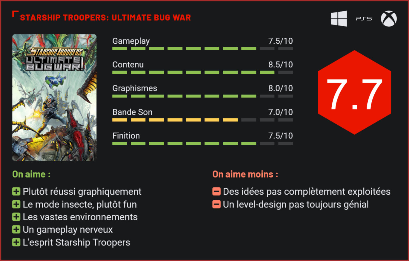 Avec son style rétro qui rappelle les FPS des années 90, Ultimate Bug War s’annonçait comme une adaptation ambitieuse de la légendaire saga des Starship Troopers. Et le tire s’impose comme une jolie réussite. Il faut l’avouer, les fans ne savaient pas trop quoi penser à la présentation de la première bande annonce d’Ultimate Bug War. D’un côté, le fait que Dotemu était aux commandes était plutôt rassurant. De l’autre, les premières séquences de gameplay montrées n’étaient pas forcément convaincantes. Que les fans se rassurent, le jeu développé par Auroch Digital est une vraie bonne surprise. Explications. Visuellement, le jeu est plutôt convaincant. Inspiré du film de science-fiction de Paul Verhoeven, Ultimate Bug War est un jeu qui ne se prend pas du tout au sérieux au niveau de son scénario. Le jeu se présente comme une « simulation d’entraînement officielle » créée par FedDev, le développeur d’État de la Fédération des Citoyens Unis. Le joueur y incarne le Major Samantha “Sammy” Dietz, aux côtés du légendaire General Johnny Rico. A la tête d’escouade de marines, il faudra repousser les insectes géants dans les confins de la galaxie. Côté scénario, on a droit à de jolies cinématiques mettant en scène des acteurs réels, l’humour conserve le ton du film et c’est un vrai plus. Le jeu n’hésite d’ailleurs pas à jouer la carte du fan-service, pour le plus grand bonheur des fans. Les décors sont assez variés. Pour le reste, ce Ultimate Bug War n’a pas grand chose en commun avec Extermination, la dernière adaptation en jeu de Starship Troopers. UBW se présente comme un FPS rétro, avec un gameplay très nerveux et jouable uniquement en solo. La particularité du titre ? Il nous plonge dans des environnements bac à sable où le joueur est libre de réaliser les missions dans l’ordre de son choix. Les décors sont plutôt vastes et sont surtout le théâtre d’affrontements dantesques entre des forces de marines et des hordes d’insectes géants. Le jeu joue la carte de la démesure et ça marche plutôt bien. Côté gameplay, c’est nerveux, fun et il y a tout de même plus de 30 armes différentes à tester. Le jeu ose aussi la carte de l’originalité avec un mode de jeu alternatif dans lequel on incarne un insecte géant. Ca double pratiquement la durée de vie et surtout apporte une approche différente. L’insecte peut prendre différentes formes pour voler par exemple dans d’autres zones de jeu, appeler des renforts auprès des nids, et combattre les marines et les découpant en rondelles. C’est globalement assez fun, même si on sent que l’idée n’est qu’effleurée. On aurait clairement aimé que le concept soit davantage développé. En l’état, reste un mode de jeu fun le temps de quelques parties, mais qui aurait clairement mérité plus d’attention. Sur le plan technique, le jeu est plutôt beau avec de très jolis environnements en 3D, des insectes joliment modélisés, mais des modèles rétro 2D pas très convaincants pour les humains. Les deux touches (2D – 3D) ne fusionnent pas très bien. L’arsenal comprend 30 armes différentes. Globalement, Ultimate Bug War reste toutefois un boomer shooter très convaincant, ce qui n’est déjà pas si mal pour un petit jeu indépendant. On sent clairement un gros potentiel. Reste à présent à voir si celui-ci aura droit à une suite plus ambitieuse… Conclusion Sortie de nulle part, cette adaptation du film Starship Troopers en shooter rétro est une jolie réussite pour le studio Auroch Digital, qui nous livre un FPS à l’ancienne, façon Doom, qui a plus d’une corde à son arc pour séduire. Avec ses vastes champs de bataille, ses combats intenses, son mode Insecte surprenant, ses jolis graphismes, le titre se laisse agréablement prendre en main. On le sent toutefois, le studio n’a pas pu aller au bout de ses idées. Le level-design n’est pas toujours convaincant. Certaines séquences de jeu sont moins réussies que d’autres. Et globalement, si le mode Insecte est fun, il reste beaucoup trop basique pour totalement convaincre. Que les fans de Starship Troopers se réjouissent toutefois, il s’agit sans l’ombre d’un doute de l’adaptation la plus réussie de la saga à ce jour !