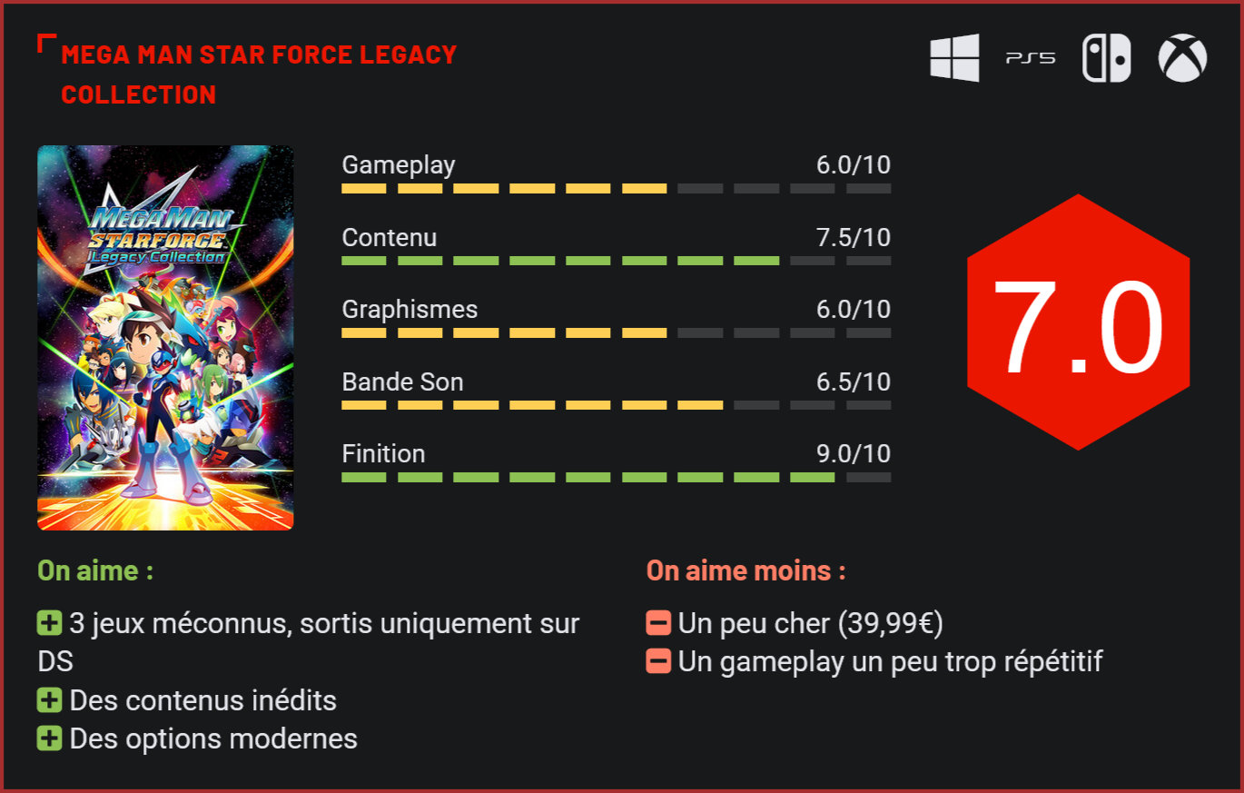 Relativement méconnue du grand public, la série des Star-Fore, une sous-série de la saga MegaMan a enfin droit aux honneurs d’une compilation avec Mega Man Star Force Legacy Collection. Si Megaman est une licence emblématique du catalogue de Capcom, il ne s’agit pas de la plus populaire. Il faut bien l’avouer, Megaman est un peu tombé en désuétude ces dernières années. Capcom essaye toutefois de lui redonner ses lettres de noblesse avec une série de compilation qui remet en valeur sa gloire passée. Avec Mega Man Star Force Legacy Collection, l’éditeur remet sous le feu des projecteurs une sous-série peu connue, sortie à l’époque sur Nintendo DS. Si Capcom évoque une compilation de 7 jeux dans sa communication, Mega Man Star Force Legacy Collection rassemble en réalité 3 jeux différents, lesquels comportent plusieurs variantes qui diffèrent légèrement au niveau des boss et cartes. Vendue 39,99€, la compilation permet donc de redécouvrir 3 épisodes moins connus de la franchise et surtout joliment modernisés. Première amélioration notable : les jeux se jouent sur un seul écran. Ca peut paraître évident comme ça, mais les titres étaient sortis à la base sur une console avec laquelle les jeux devaient exploiter une interface sur deux écrans. Capcom a réalisé un joli travail à ce niveau pour rendre tout cela fonctionnel. Côté fonctionnalités, on a aussi droit à plein d’améliorations : sauvegardes automatiques, accélération de la vitesse de jeu, système de visage revu,… Le gameplay a été joliment modernisé et il est possible d’opter entre plusieurs configurations. Le jeu s’offre également des contenus additionnels par rapport à l’original avec l’ajout d’une large galerie de photos, d’un jukebox, et de combats en ligne entre joueurs. Le jeu en ligne n’est pas la finalité en soi, mais pour les fans, il faut reconnaitre qu’il s’agit là d’un joli ajout. Côté réalisation, on a droit à des retouches. On retrouve la bande son originale et une bande son réorchestrée, quelques filtres visuels ont été ajoutés et globalement les modèles 3D ont été upscalés. Ce n’est pas un remake mais un remaster solide. Et c’est déjà pas mal. De toute manière, l’intérêt de ce type de compilation réside avant tout dans la disponibilité du titre sur de nouveaux supports. Alors oui, on pourra reprocher au titre d’être un peu cher. Les fans se jetteront sans doute dessus car pour eux, l’accès à ces 3 jeux n’a pas de prix. Mais il faut reconnaitre que 39,99€ pour une compilation de 3 vieux jeux DS, c’est un peu cher. Aussi sympathiques puissent-ils être… Mêlant action et stratégie avec son système de combat basé sur l’utilisation de cartes, Star Force est un jeu atypique dans la série, qui a mal vieilli. Certains mécanismes sont vieillots et surtout le jeu a tendance à être très répétitif. Reste qu’encore une fois, cette compilation s’adresse avant tout aux fans purs et durs de la franchise, qui fermeront facilement les yeux sur ses défauts. Conclusion Avec Mega Man Star Force Legacy Collection, Capcom livre une compilation de 3 épisodes méconnus de la franchise, sortis à l’époque sur DS. Forcément, ça a vieilli, tant au niveau du gameplay, fort répétitif, que de la réalisation. Néanmoins, il faut bien admettre que pour les fans, cette compilation est du pain béni, ne serait-ce que parce qu’elle nous redonne accès à 3 jeux qui n’étaient jamais sortis sur d’autres supports. Capcom a de surcroit soigné sa compil’ en intégrant des tas de nouveautés et en modernisant son interface. Alors oui, 39,99€, c’est un peu cher, mais pour les fans de la franchise, cette compilation n’a probablement pas de prix.