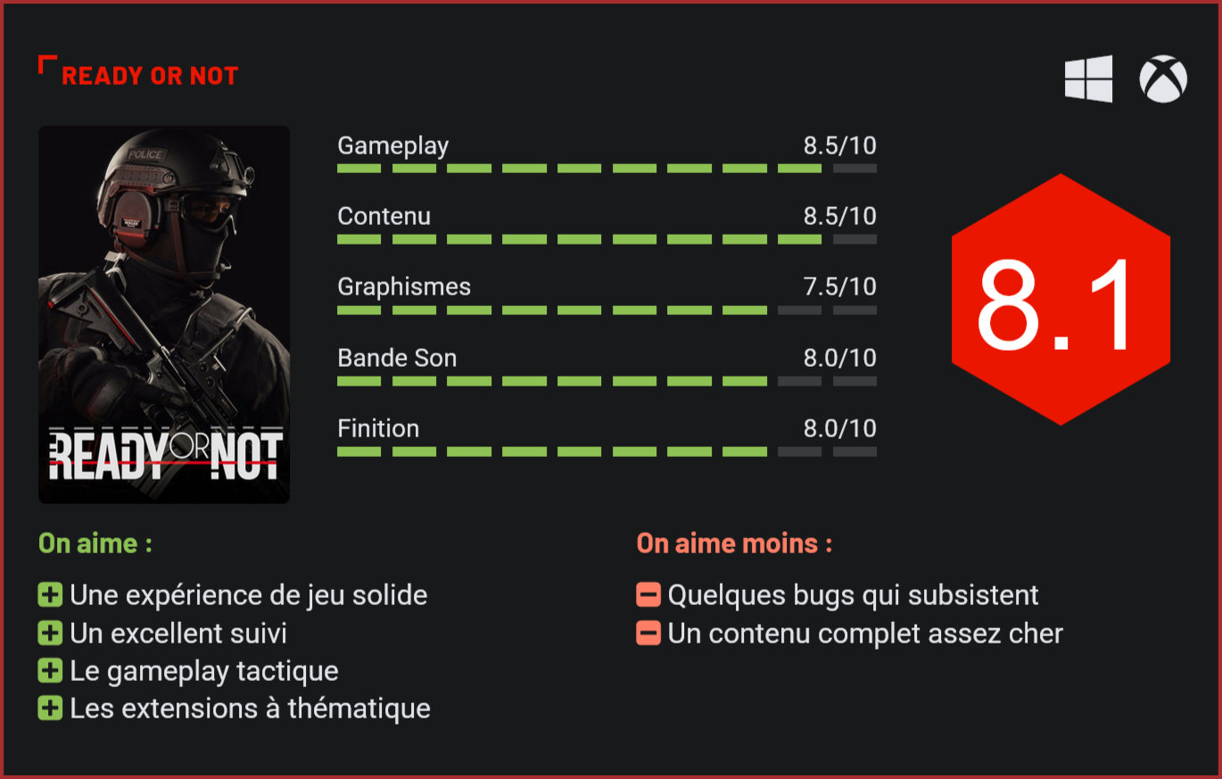 Sorti en décembre 2023, Ready or not s’est vite imposé comme le fils-spirituel de Rainbow Six et de SWAT. Deux ans après sa sortie, il a déjà eu droit à trois extensions très solides et s’est considérablement amélioré. L’occasion pour nous de faire le point sur cet excellent titre. Les FPS tactiques n’ont plus la cote. De SWAT à Operation Flashpoint, on ne compte plus le nombre de licences mortes et enterrées. Seul Rainbow Six fait de la résistance, mais la licence d’Ubisoft s’est totalement réinventée en jeu compétitif opposant deux équipes de joueurs. Ready or not est dans ce contexte le seul représentant du genre à proposer une expérience PvE (joueurs contre IA). Et il le fait plutôt bien. Pour ceux qui n’y auraient jamais joué, Ready or Not est donc un FPS tactique très proche des “anciens” Rainbow Six. Il est jouable en solitaire mais c’est bien entendu dans son mode multijoueur coopératif qu’il montre son plein potentiel et se révèle le plus captivant. Ici, la moindre erreur peut mener à la mort. Le joueur doit aussi respecter des règles d’engagement. Hors de question de dézinguer les civiles. Il faudra agir avec prudence, stratégie et professionnalisme, tel un véritable membre des forces spéciales. Le vrai plus par rapport aux “anciens” Rainbow Six ? Le titre a été pensé pour la coop et est jouable jusqu’à cinq joueurs. Les parties sont tendues et peuvent tourner au drame quand un joueur fait n’importe quoi. A la fois stressant, intense, nerveux et parfois très drôle, Ready or not est un jeu qui s’apprécie de préférence entre amis. Et depuis sa sortie, il faut bien admettre que le jeu a bien changé. Il s’est enrichi de 3 extensions payantes, Home Invasasion, qui mettait l’accent sur des assauts coordonnés dans des espaces confinés, Dark Waters, avec un focus sur un contexte nautique, et Boiling Point, tout juste sorti, qui nous propose trois nouvelles cartes sur le thème des émeutes. Outre de nouvelles missions, les extensions ajoutent de nombreux contenus additionnels, dont de nouvelles armes. Le jeu, lui, a évolué dans la bonne direction avec un contenu plus riche et certains aspects du titre repensés. De nombreux bugs ont été corrigés (+ de 200 rien qu’avec la dernière mise à jour !), l’IA s’est améliorée avec des comportements beaucoup plus réalistes que par le passé, et le gameplay a été peaufiné sans être transcendé, avec toujours plus de réalisme dans les actions. Ready or not est plus que jamais la référence du FPS tactique. Alors oui, il reste assurément des choses à améliorer : l’IA est parfois inégale dans ses actions, le jeu n’a pas ajouté de contenu qui change les règles du jeu (un PvP très attendu par exemple) et graphiquement, ça a un peu vieilli, mais quel pied pour ceux qui adorent ce genre, sous-représenté aujourd’hui ! Conclusion Depuis sa sortie initiale, Ready or not a eu droit à de nombreuses améliorations avec un gameplay peaufiné, des bugs corrigés et une nombre impressionnant d’ajouts (armes, cartes, missions). Certes, il faudra débourser 10€ par extension pour profiter d’une expérience “complète”, mais le jeu en vaut largement la chandelle avec des extensions à thématique très réussies, une communauté unie derrière un projet qui s’est définitivement engagé dans la bonne direction. Faut-il y jouer en 2026 ? Assurément, c’est le FPS tactique du moment.